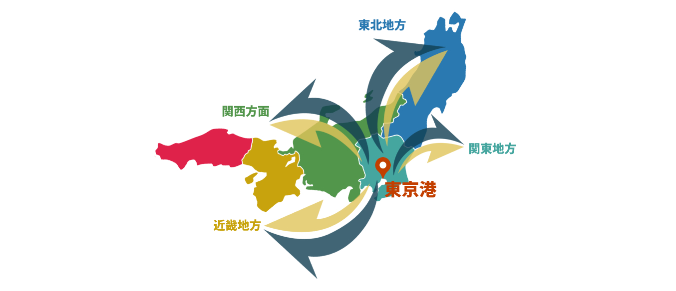 東京港~関東をメインに東北、近畿、関西方面までの輸送を主に行っております。